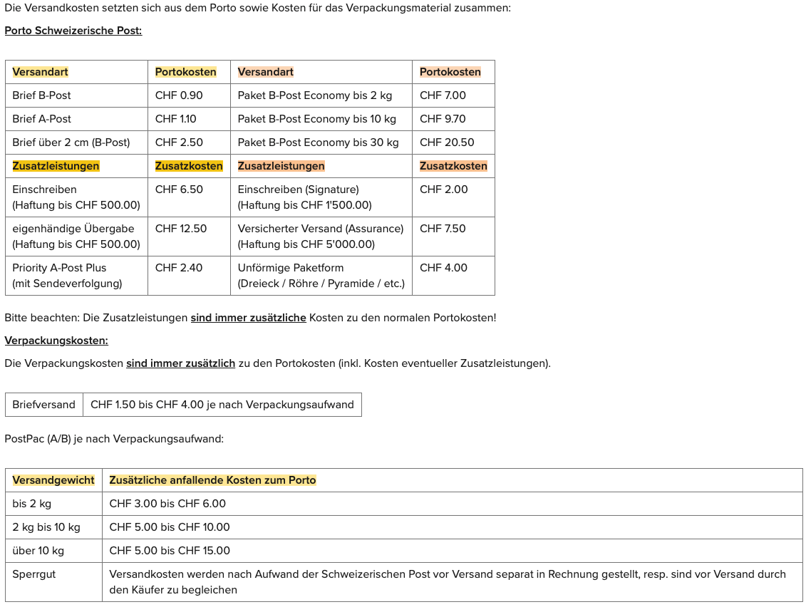Zusätzlich fallen CHF 3.00 bis CHF 7.00 für Verpackung und Versand an, welche mit den Versandkosten (Tarif Schweizerische Post) geltend gemacht werden. Die genauen Versandkosten sind in den jeweiligen Angeboten in meinem WEBShop oder meinem Shop auf Ricardo.ch aufgeführt.