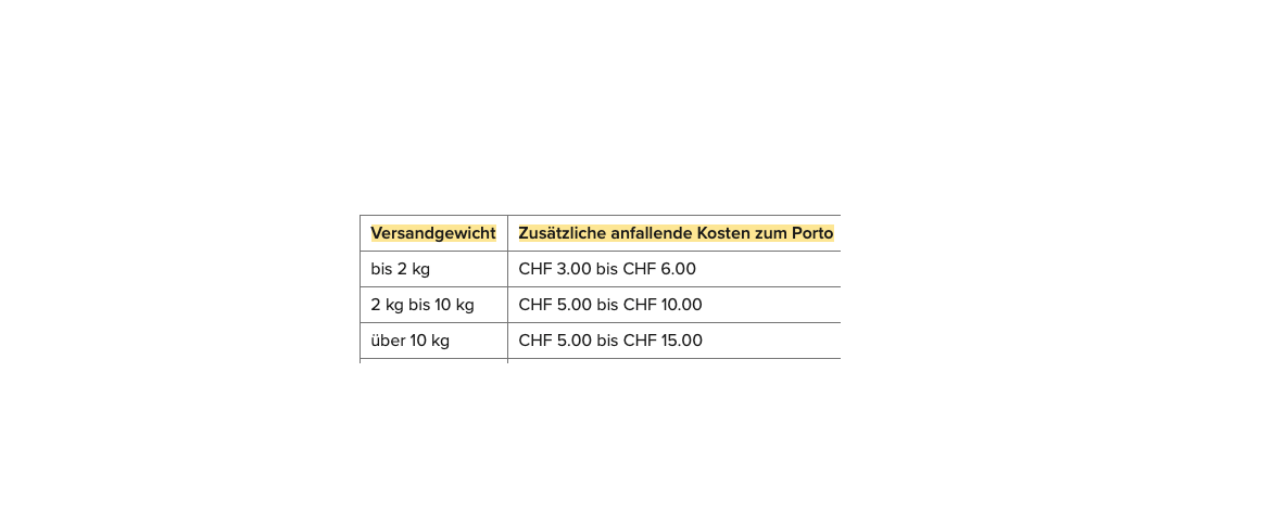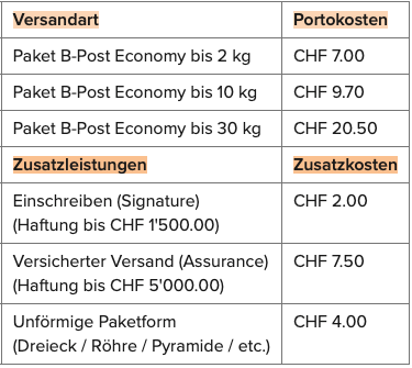 In der Tabelle oben können Sie die Portokosten für den Paketversand sowie die Kosten für allfällige Zusatzleistungen entnehmen.