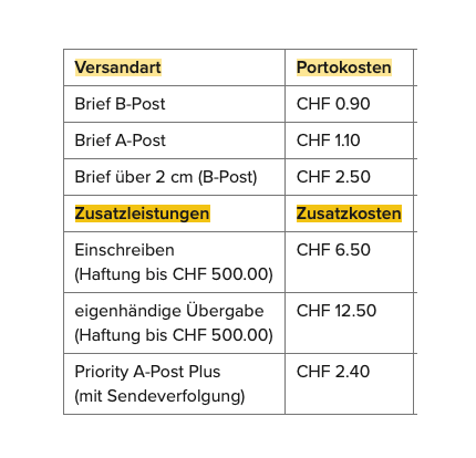 In der Tabelle oben können Sie die Portokosten für den Briefversand sowie die Kosten für allfällige Zusatzleistungen entnehmen.